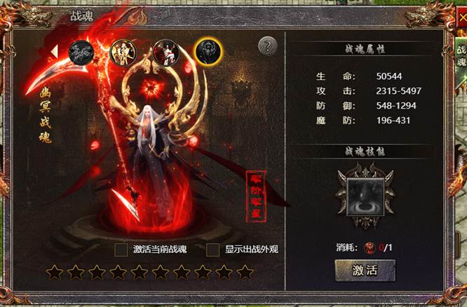 激活战魂可获得大量属性以及强力buff:受到攻击时,有概率为主角施加5层“幽冥血”,单次受到伤害超过最大生命值10%时,消耗1层效果并使本次伤害减半,激活后永久生效