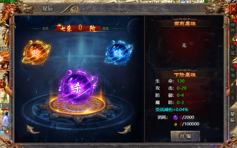 消耗精魄可以升级星辰系统,升级后会获得大量属性;